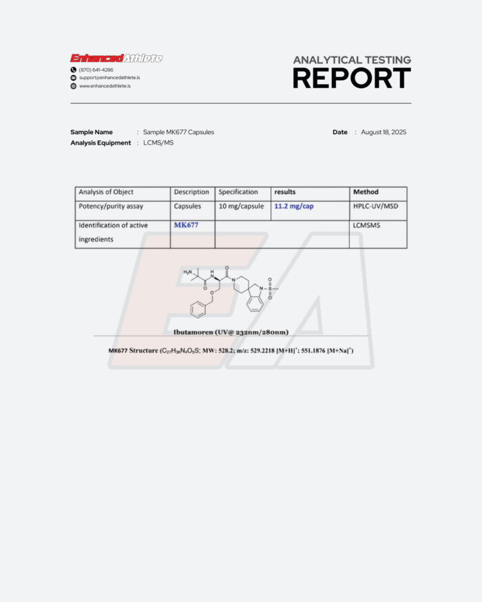 Mk-677 is a growth hormone secretagogue originally developed by Reverse Pharmacology. A secretagogue is a substance that causes another substance to be secreted. So in this case, mk-677 signals the pituitary gland to secrete growth hormone. Mk-677 could be compared to secretagogue peptides like GHRP-6 or Ipamorelin, only it doesn’t require injections. Mk-677 was originally developed for the treatment of elderly patients to combat muscle wasting, obesity and osteoporosis. Although commonly referred and sold as a Selective Androgen Receptor Modulator (SARM), Mk-677 is actually not a SARM and is non-hormonal. As a result, Mk-677 does not affect natural testosterone production or the Hypothalamus-Pituitary-Testes-Axis (HPTA). This means that no post cycle therapy (PCT) is needed after Mk-677 usage and that Mk-677 can be safely included into PCTs and bridges between steroid cycles.